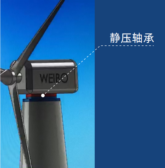 我们常在海边看到无法转动的风力发电塔, 绝大部份都是因为里头的发电机传动轴下面支撑的 4~8 组轴承生锈、 或是因为叶片组的重量导致这些传统轴承时间长产生微变形导致阻抗变大。 以国内的现有风力发电塔, 平均需要约五级风力才能转动叶片来发电。 但以我们的WBR-1700 静压轴承转台, 转动件超过 4 吨, 用一根手指头就能轻松转动, 如此极低的摩擦力, 改用静压轴承后, 大概二级风、 甚至一级风就能轻松让叶片旋转发电了!改善的风力发电效益, 至少就提升 2 倍以上!